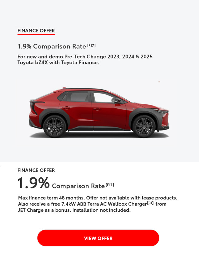 [F17] Finance application must be received by 31/12/2025. Vehicle must be delivered, and finance application must be settled by 15/01/2026. Not to be used in conjunction with any other offer. Approved applicants only. Terms, conditions, fees, charges & lending criteria apply. Comparison rate is based on a 5 year secured consumer fixed rate loan of $30,000. WARNING: This comparison rate is true only for the examples given and may not include all fees and charges. Different terms, fees or other loan amounts might result in a different comparison rate. Toyota Finance is a division of Toyota Finance Australia Limited ABN 48 002 435 181, AFSL and Australian Credit Licence 392536 and reserves the right to change, extend or withdraw this offer.