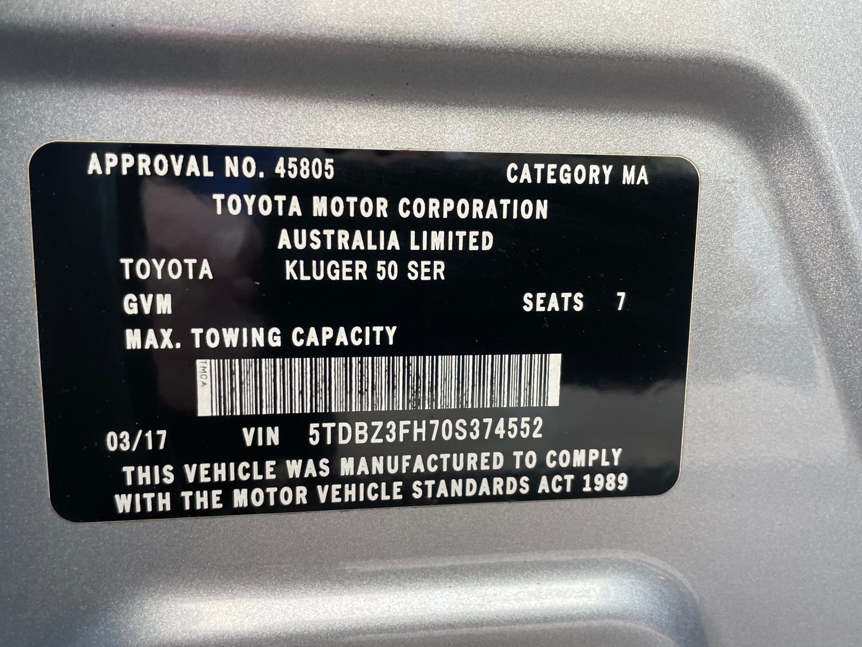 2017 Toyota Kluger GXL AWD. This vehicle was purchased from our dealership new and has complete up to date full Toyota service history, 2 x keys and all owners manuals. Vehicle features, reverse camera, 7 seater, cruise control, dual air-conditioning, electric tail gate, heated front seats, satellite navigation, keyless entry, push button start, side steps, roof racks, tow bar, 4 near new tyres plus lots more. The vehicle is in excellent condition inside and out. Inspect today and get that Oh What A Feeling Toyota. Vehicle is ready for immediate delivery.